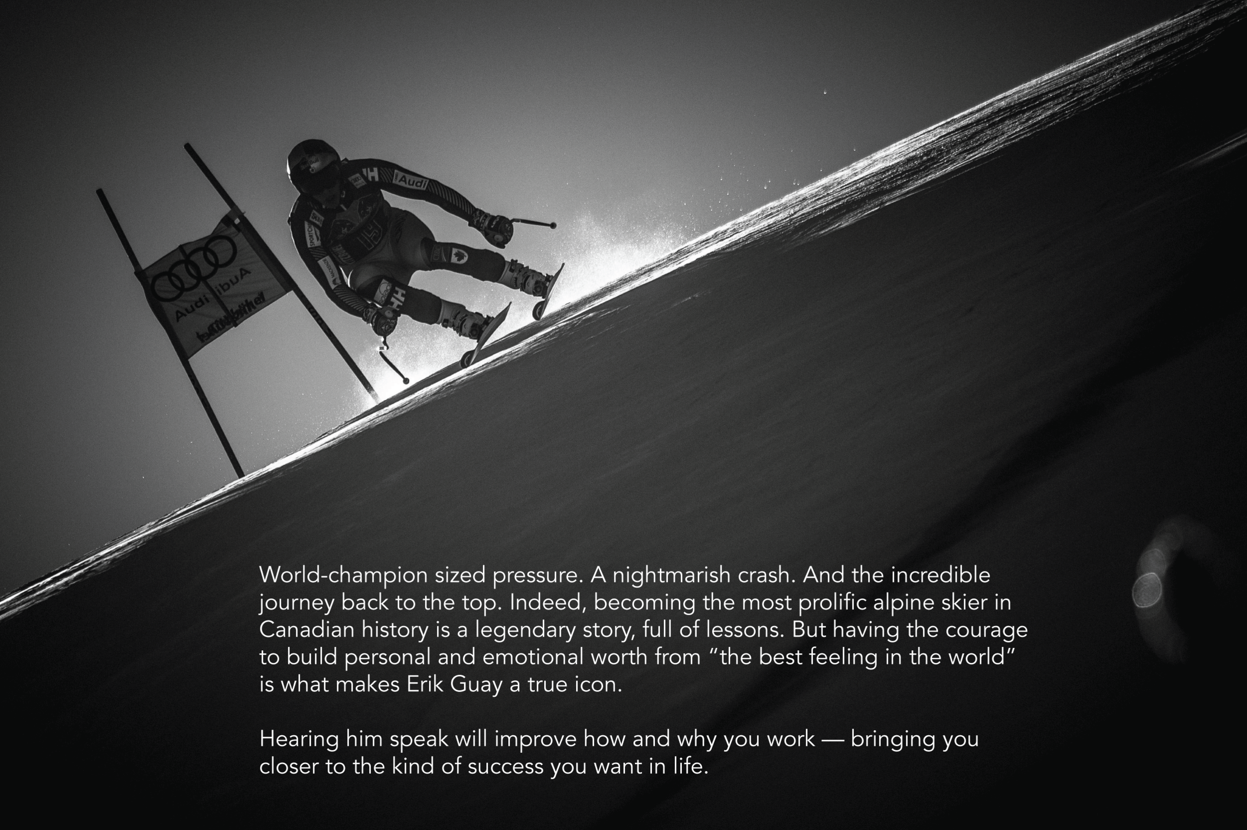 Not long after his retirement, Erik Guay reached out for help with his corporate conférence. As the most decorated Canadian alpine ski racer, his story is naturally interesting to those looking for success. I worked with him to not only give it structure and appealing imagery, but — most importantly — relatability.